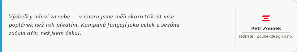 Stínící technika má jasnou sezónu. Většina hráčů na trhu to ví a v březnu začnou tlačit na plyn všichni najednou. Ceny za proklik rostou, pozornost zákazníků je roztříštěná a o poptávky se dělí desítky firem.Proto spouštíme klíčové kampaně dříve — v době, kdy konkurence ještě čeká. Leden a únor jsou z pohledu ceny médií relativně klidné. Zákazník v té době sice pergolu ještě nekupuje, ale začíná přemýšlet. A pokud jsme s ním v kontaktu jako první, máme náskok, který se v březnu a dubnu projeví na objemu poptávek.Tohle načasování není intuitivní — data z předchozích sezón ale jednoznačně ukazují, že zákazníci, kteří přišli v hlavní sezóně, měli s brandem kontakt týdny předtím.