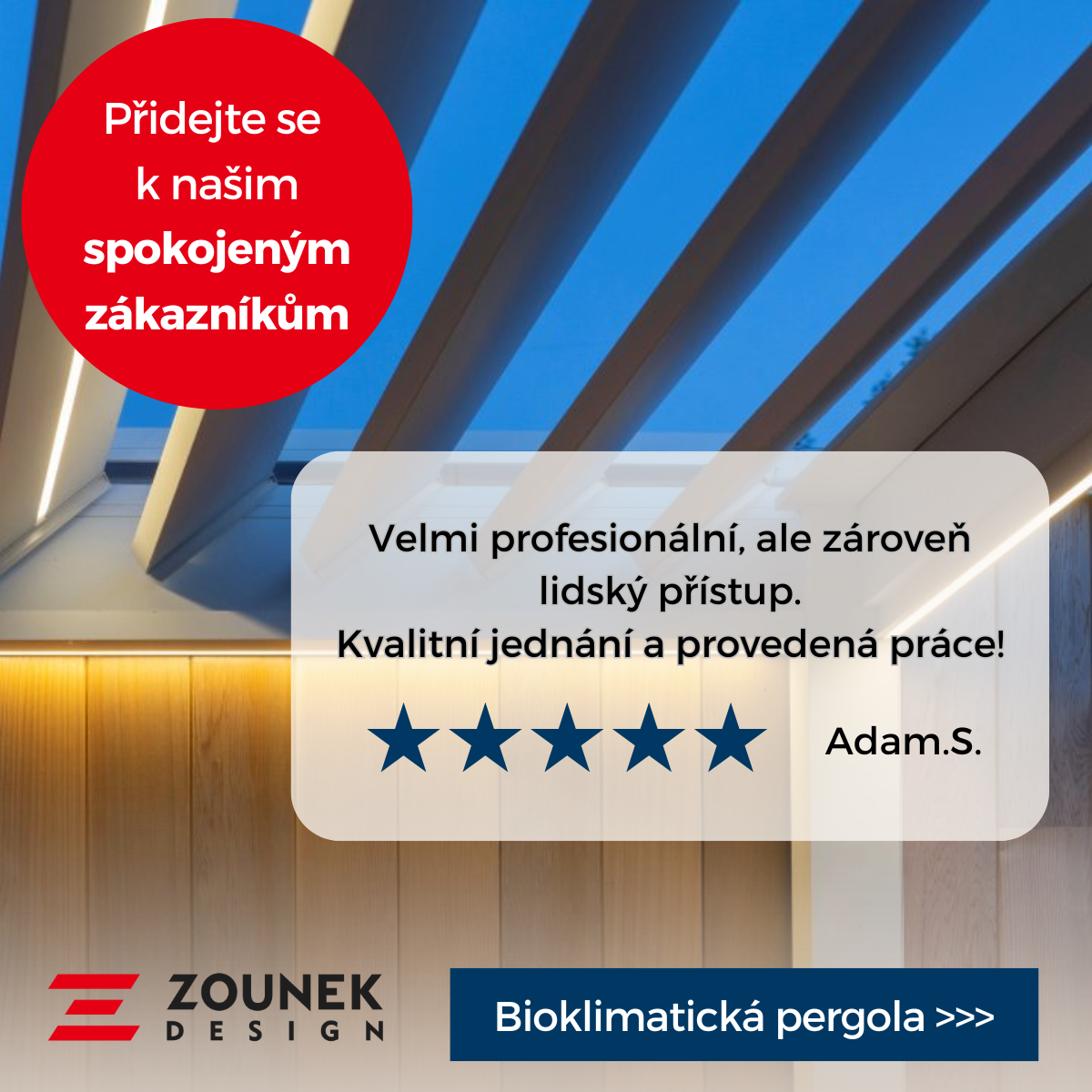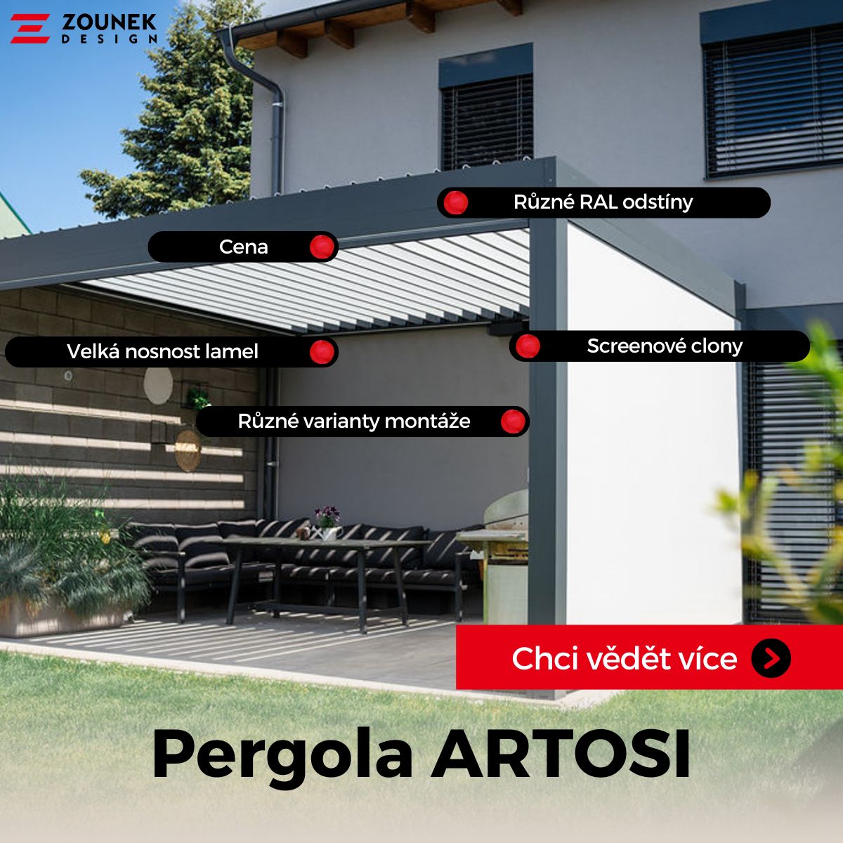 Klient: Zounekdesign.cz — prémiové stínění interiérů i exteriérů, bioklimatické pergoly, markýzy, venkovní žaluzie